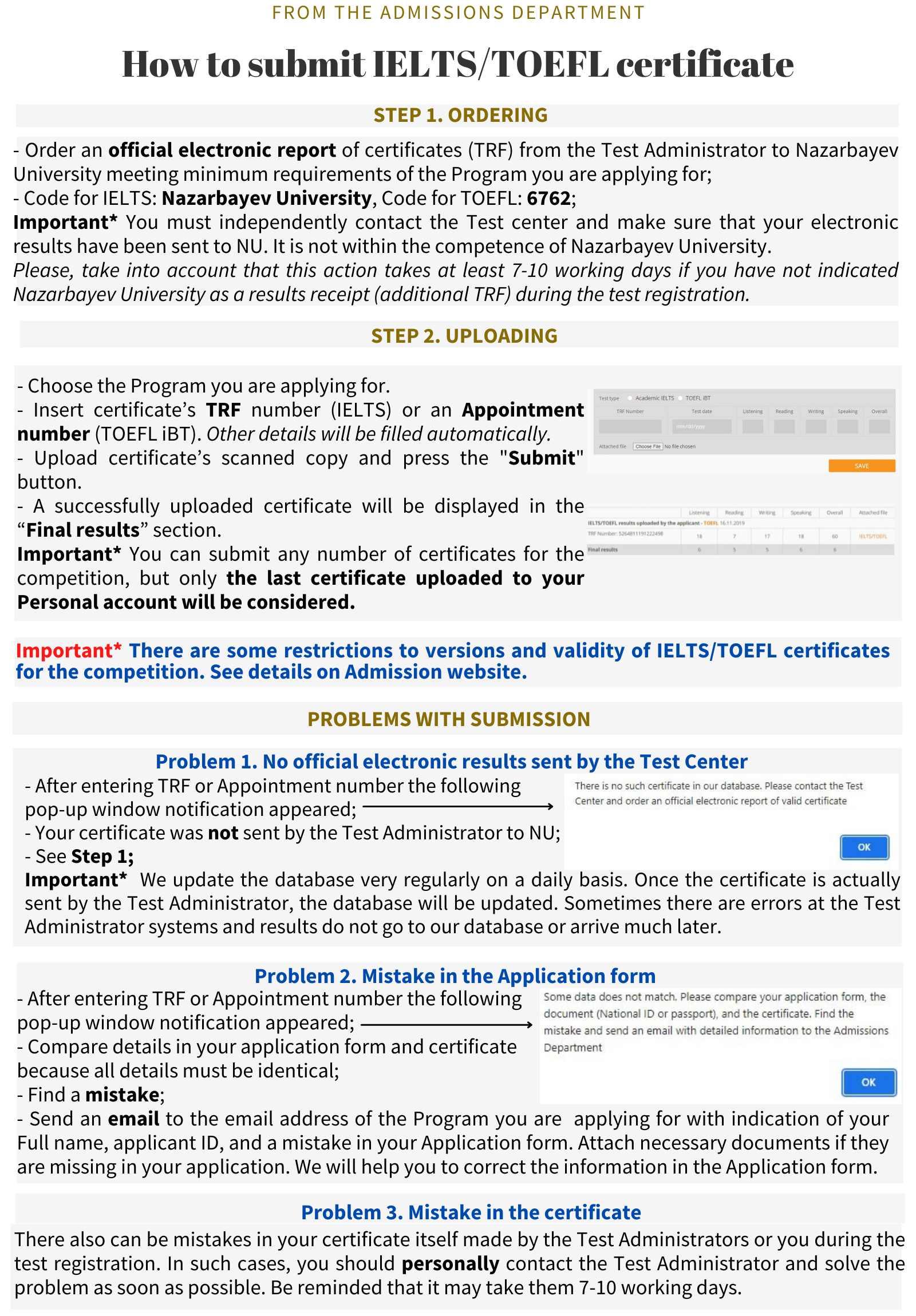 Please note that submission of IELTS/TOEFL certificates in the electronic database of NU is not within the competence of the university. You should independently contact the test center and make sure that your certificate has been sent. Please note that this action takes at least 7-10 working days. If the certificate is received after the deadline specified by the Admissions Department, results will not be considered in the competition. |