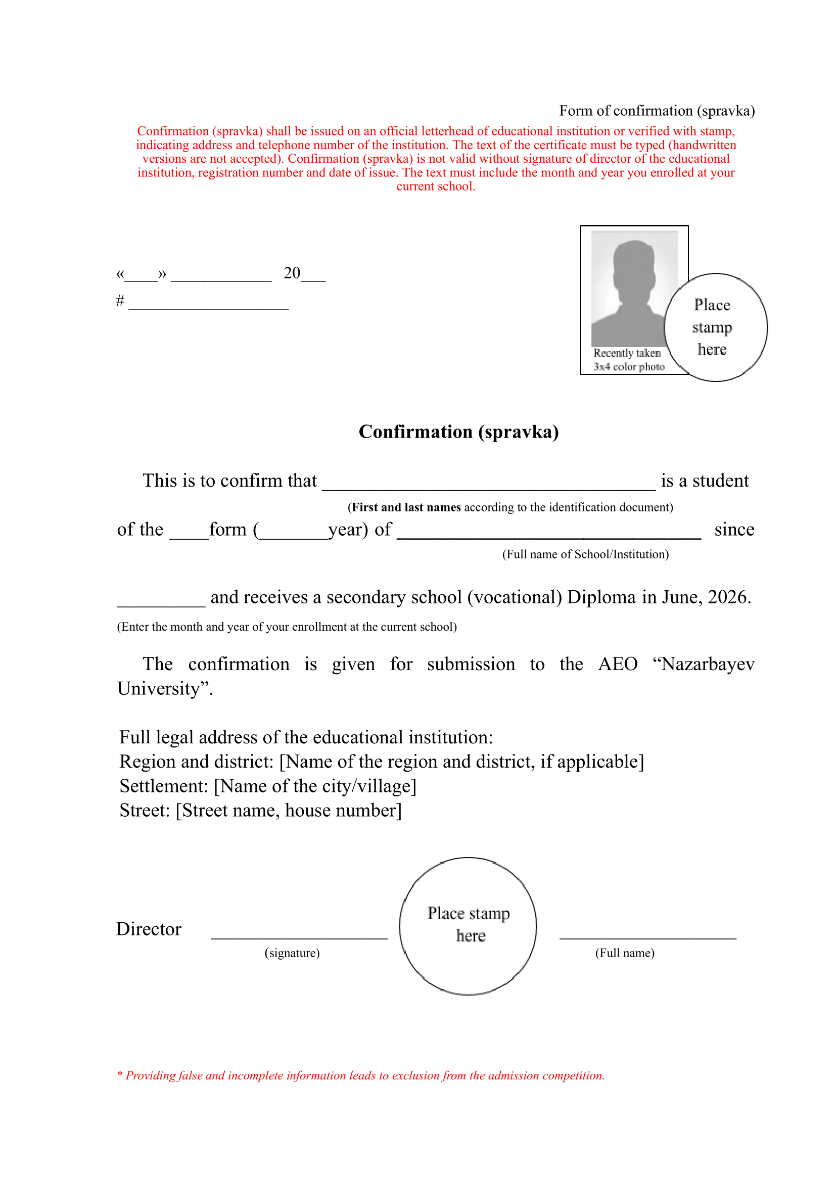 If the original of the secondary-school education diploma with transcript is not in Kazakh, Russian or English, it is additionally required to provide a scanned version of a notarized translation of this document into English. Failure to provide the required documents in time will result in the applicant's disqualification from further participation in the competition.