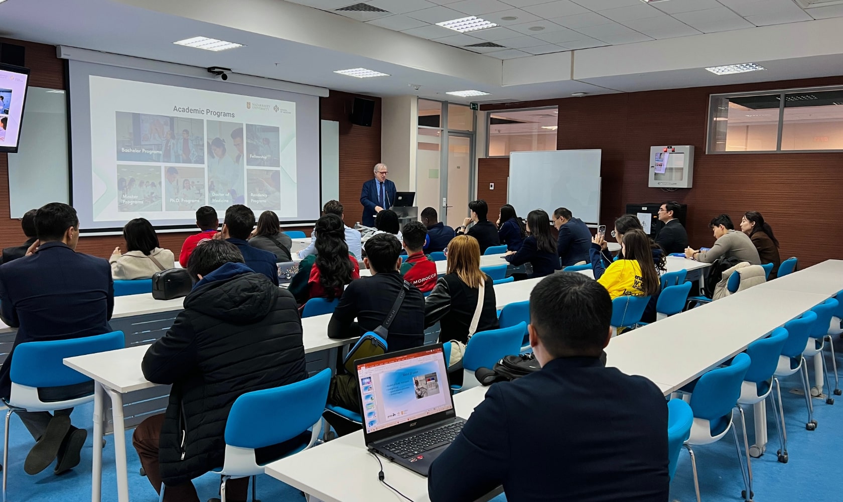 Әртүрлі елдерден келген студенттер NU Медицина мектебінің білім беру мүмкіндіктерімен танысып, Қазақстандағы медициналық зерттеулер мен денсаулық сақтау саласына қосқан үлестері туралы білді.