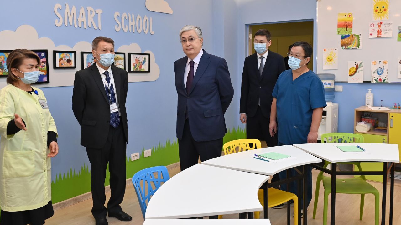 Мемлекет басшысы балаларға мектептегі оқуын жалғастыра отырып, емді үзіліссіз алуға мүмкіндік беретін Smart Classrooms ауруханалық қызметімен танысты. Балалар мектеп бағдарламасына сәйкес математика, тарих және басқа да пәндерді оқи алады. Сонымен қатар, кішкентай ем алушыларға музыкалық терапия сеанстары, аудиоертегілер, түрлі шығармашылық ойындар, шахмат ұсынылады.