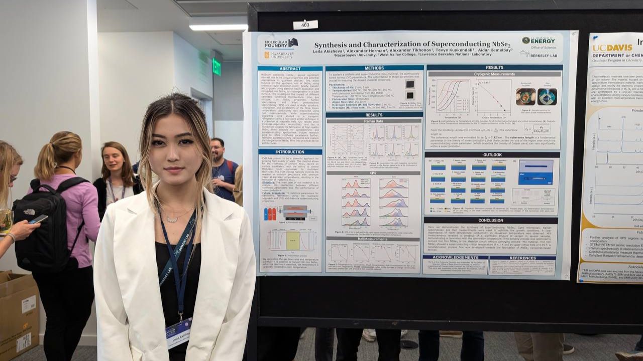 Ләйлә Ақышева: Беркли зертханасында мені суперөткізгіштік және нанофабрикация, яғни наноөлшемді материалдарды жасау немесе құрастыру тақырыбы қызықтырды. Менің жетекшілерім, Айдар Кемелбай, NU NLA -да ғылыми қызметкері болып істеген бұрында және доктор Күйкендалл суперөткізгіш ниобий селениді (NbSe2) бойынша мүлдем жаңа жобаны бастауға келісті. Үш айдың ішінде мен химиялық буларды тұндыру (CVD) арқылы суперөткізгішті синтездедім, оның электрлік қасиеттерін зерттедім, синтезделген жұқа қабықшалардың асқын өткізгіштігін өлшедім, тіпті суперөткізгіш наноөткізгіштерді жасап, сипаттадым. Бұл өте қызықты тәжірибе болды.