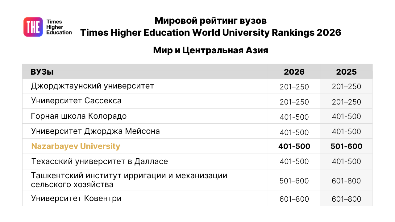 Nazarbayev University (NU) укрепил свои позиции на глобальной арене, поднявшись в топ-23% университетов мира в рейтинге Times Higher Education (THE) World University Rankings 2026.