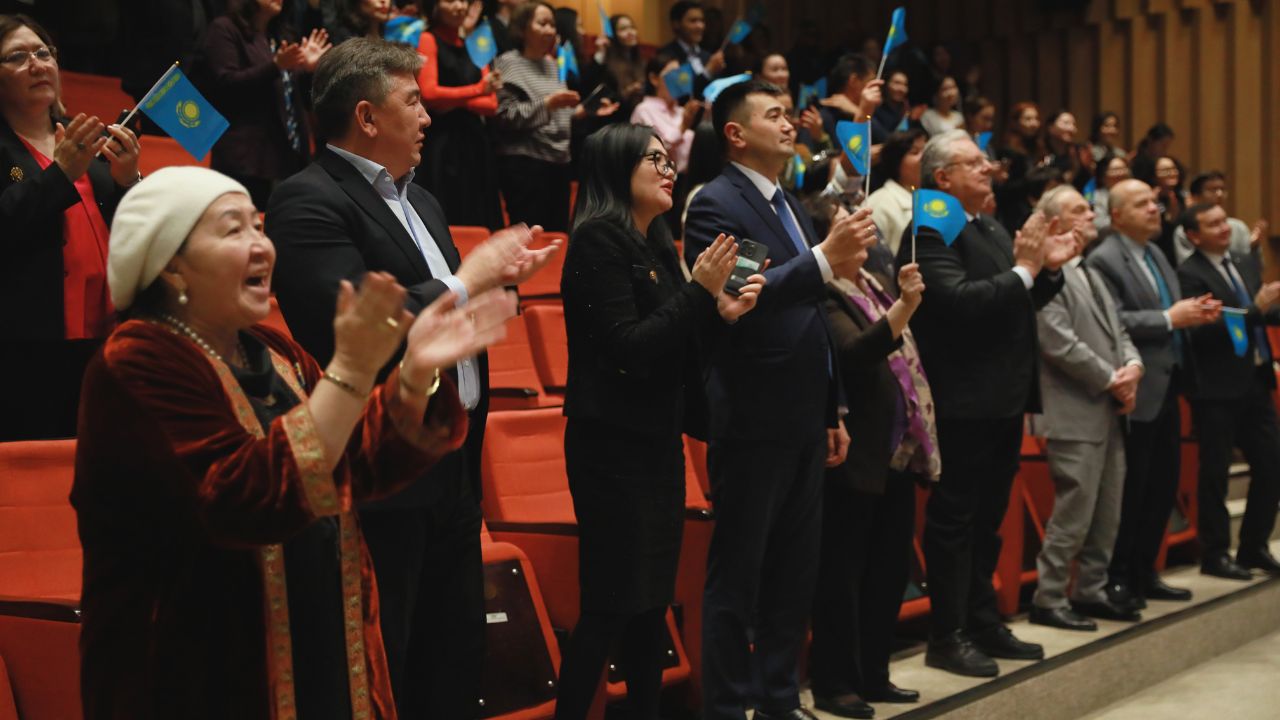 Торжественная часть продолжилась праздничным концертом, организованным при поддержке Культурного центра “Рухани жаңғыру”. С номерами выступил уже знаменитый Студенческий оркестр NU, исполнивший произведения Курмангазы “Адай” и “Ерке сылқым”, студент Ернар Жалгас сыграл терме Кадыра Мырзали “Қазақ осы”.